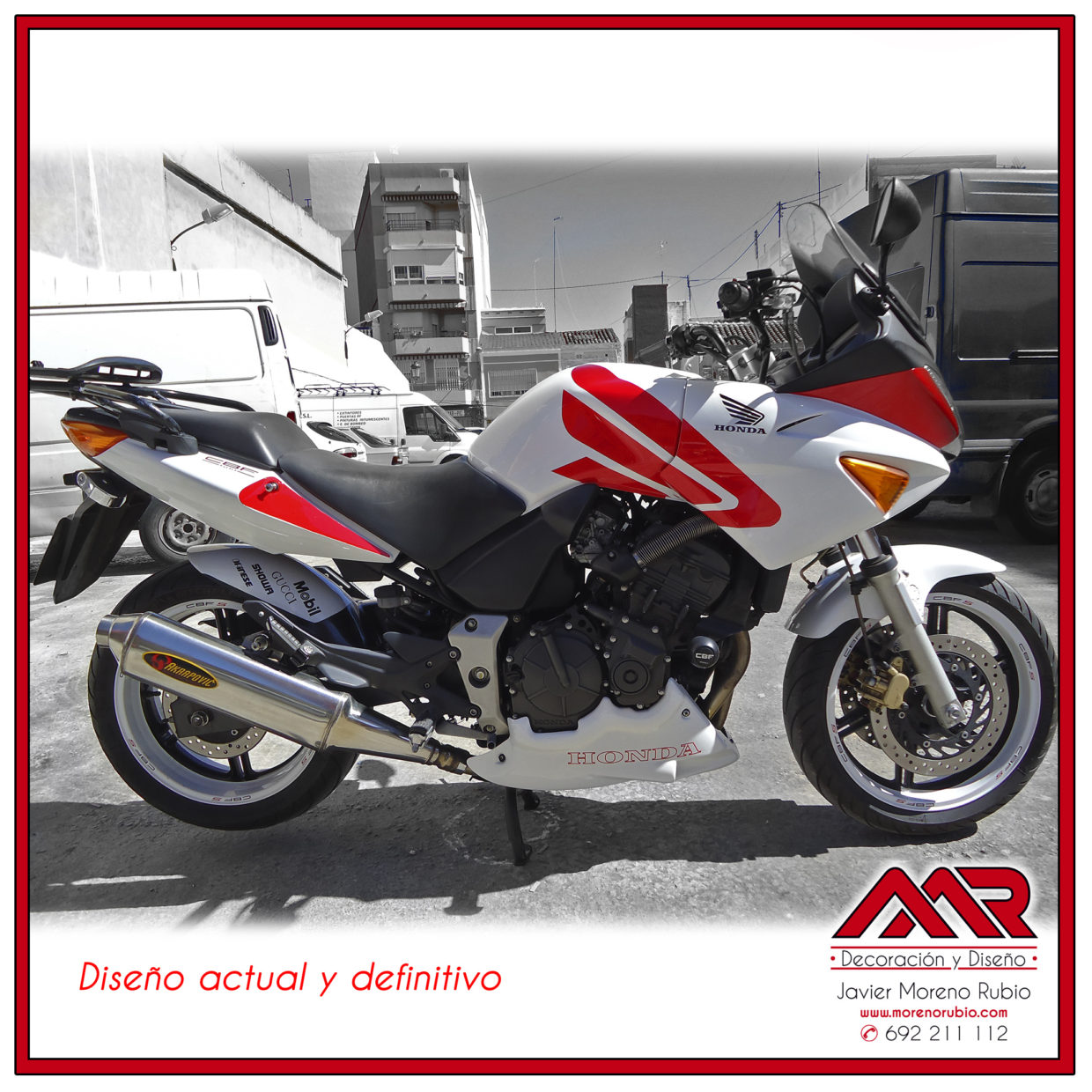 Trabajo de diseño gráfico, pintura y decoracion con máscaras y vinilos para esta Honda CBF 600. De la decoración azul original, pasando por el naranja metalizado y llantas cromadas y llegando al estado actual, un diseño mucho mas moderno y deportivo.